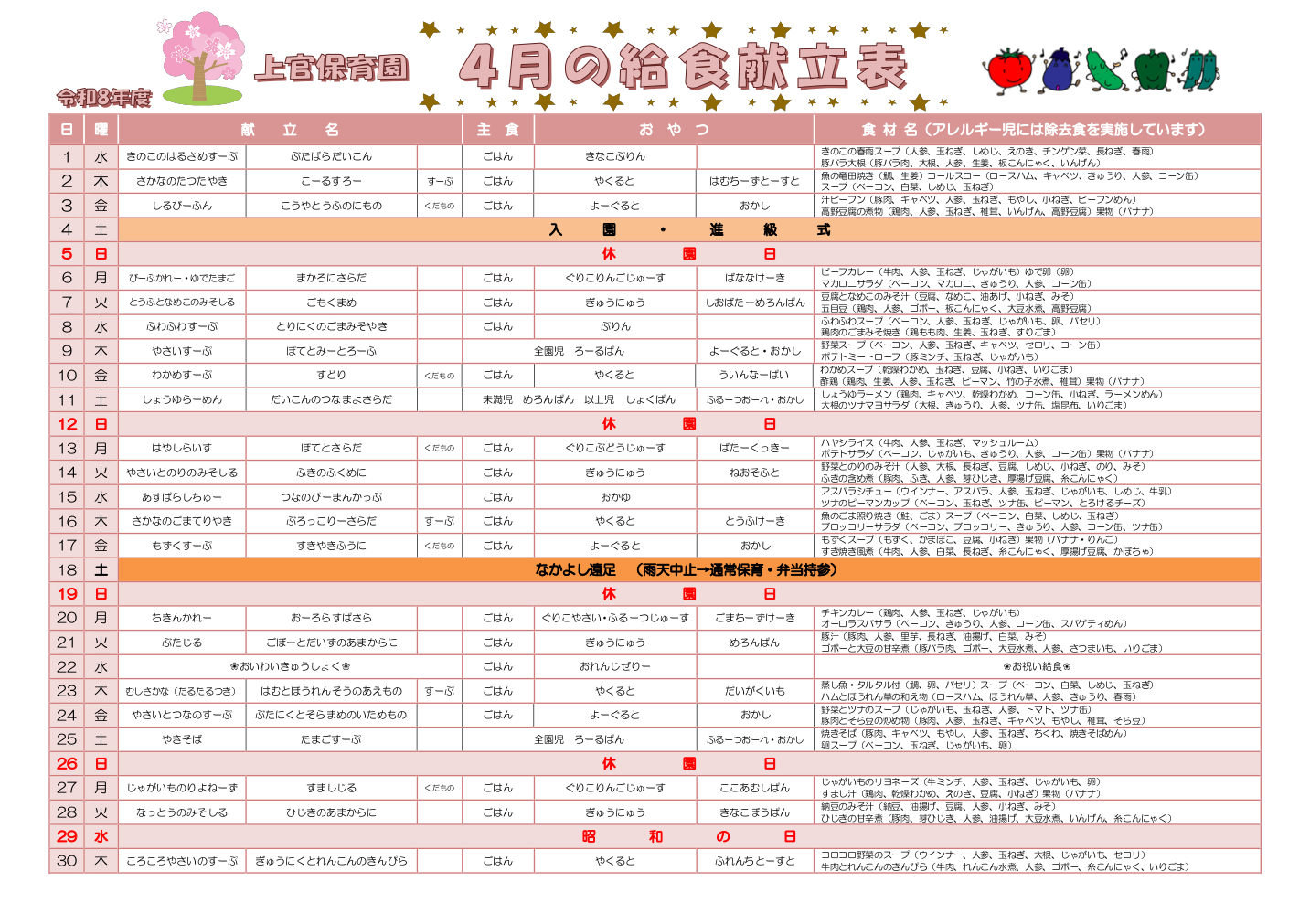 ・「バス遠足(4歳児、5歳児)」「お別れ遠足(5歳児)」の時はお弁当をお願いします。
